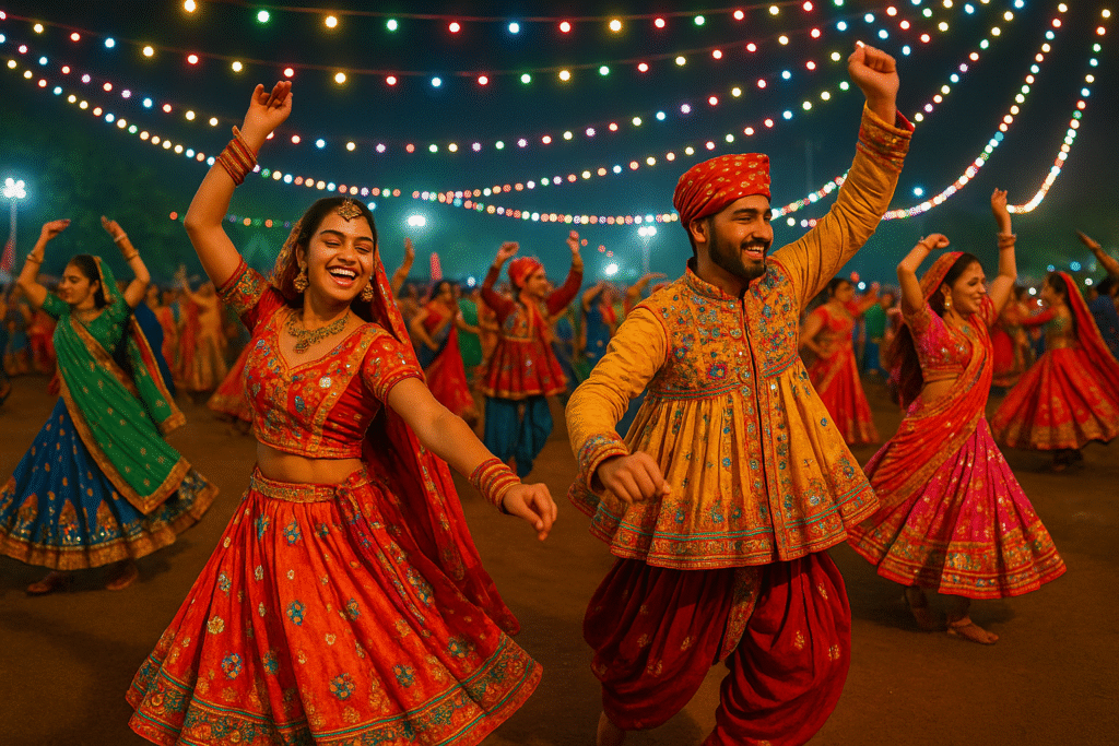 Gujarat is famous for Navratri Garba dance where thousands gather in colorful chaniya cholis to dance in circles until dawn. Dandiya Raas with colorful sticks follows, creating magical nights of music and devotion.